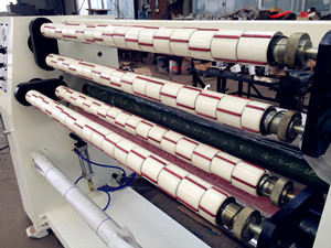 Before we start the production, we need to cut the long paper core to suitable width with the paper core cutter, then we use the paper core loader to make the small paper tubes attached on the slitting shaft.